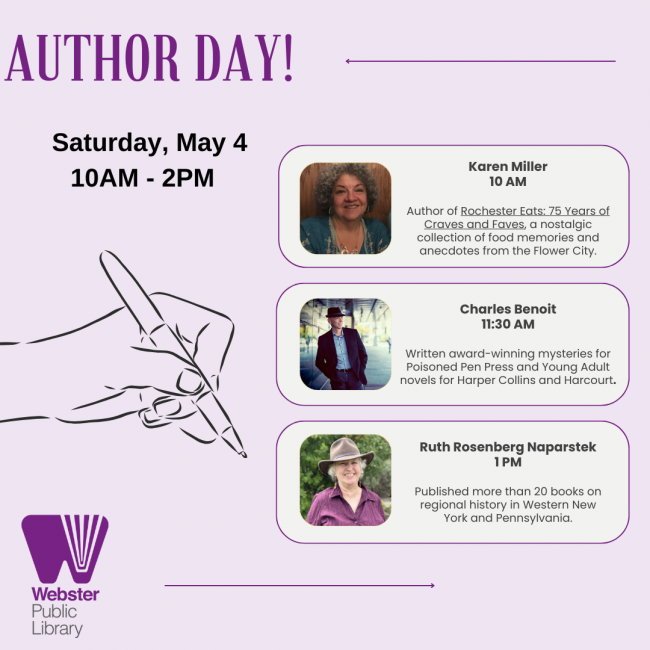 Please join us as we welcome four distinguished and local published authors,Karen Miller, Charles Benoit, Gary Craig and Ruth Rosenberg Naparstek, for a day of laughs, enlightenment and as we hear from each author as they describe the path that took them from beginning writer to published nationally known author. Each session is one hour long and there will be time for questions at the end of each session. We can't wait to hear from these four dynamic and enthralling authors. More information see the calendar.
