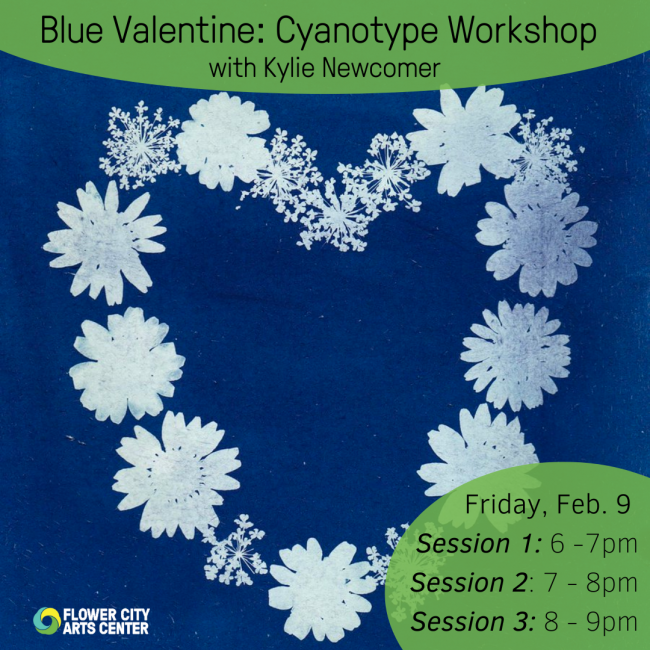 Blue Valentine: Cyanotype Workshop with Kylie Newcomer (@rodeo_clown2.0) on Friday, Feb. 9 from 6 - 7pm OR 7 - 8pm OR 8 - 9pm.