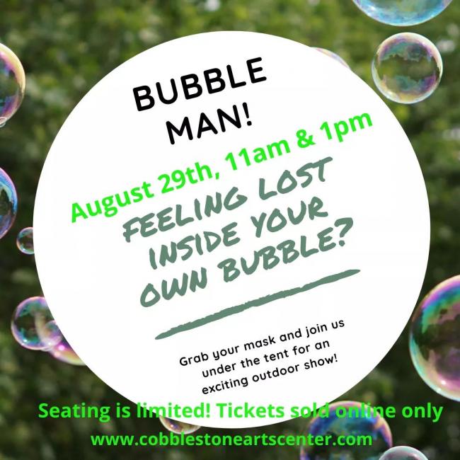 The Bubble Man, aka Doug Rougeux, will bring his awesome bubble-making magic and circus shenanigans back to Cobblestone Arts Center for some good clean fun on August 29th for performances at 11am and 1pm.