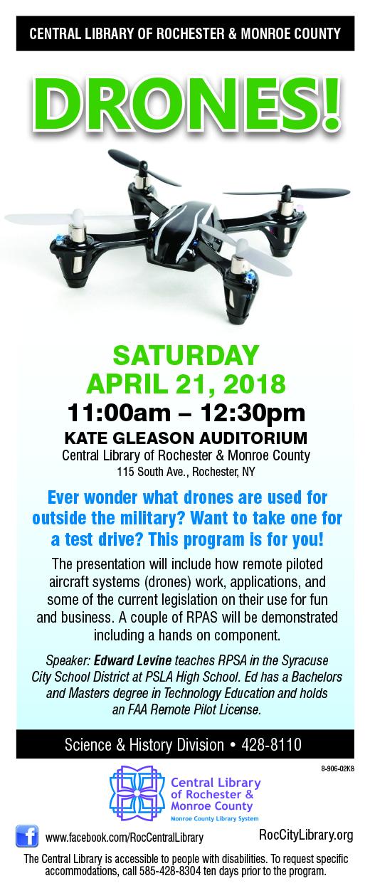 Do you ever wonder how drones can be used in civilian life? Or you want pointers on starting a local drone club? This is the program for you! This class will discuss how remotely piloted aircraft systems (RPAS), also known as drones, work, applications, and some of the current legislation on their use for fun and business. A couple of RPAS will be demonstrated including a hands on component at the end of the presentation.