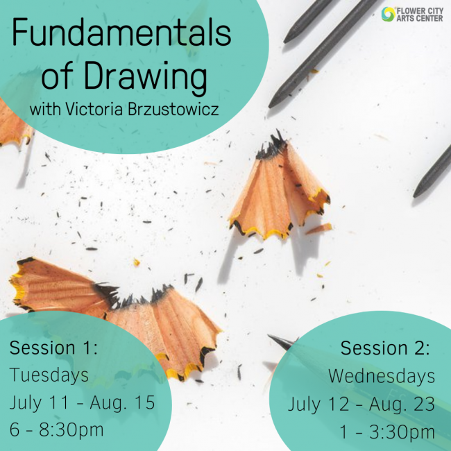 Fundamentals of Drawing with Victoria Brzustowicz (@creativevictoriab) on Tuesdays, July 11 - Aug. 15 from 6 - 8:30pm OR Wednesdays, July 12 - Aug. 16 from 1 - 3:30pm.