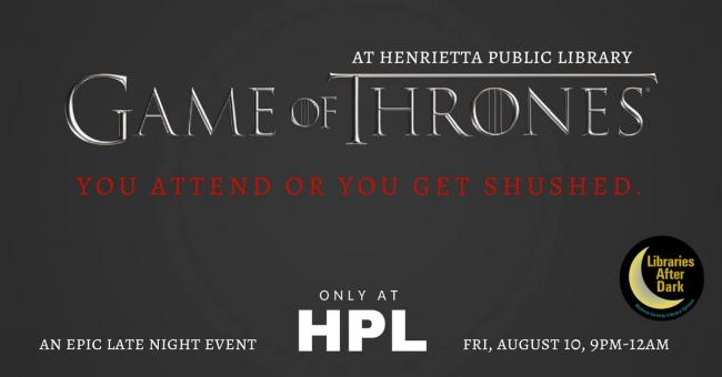 Adults ages 18 and up! Join us for an epic --and free-- evening in Westeros, complete with a trivia hosted by Geeks Who Drink, fencing demonstration, much feasting, and many George RR Martin-inspired activities! This event is part of the Libraries After Dark series of themed after-hours social events for adults. The evening will begin at 9pm, with trivia starting at 10pm. Registering for a free Eventbrite ticket will confirm your spot at trivia. For more information, please call 359-7092.