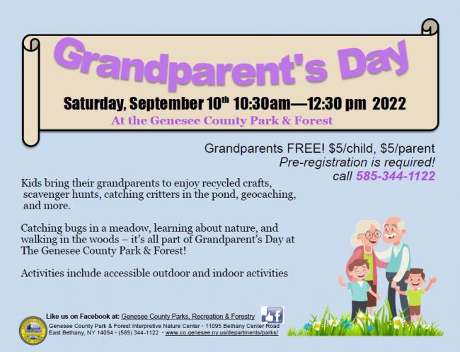 Grandparents and grandchildren are invited to a day of fun at Genesee County Park & Forest! Join us on Saturday, September 10th for a variety of activities such as arts and crafts, scavenger hunts, and bug catching. Pre-registration is required!