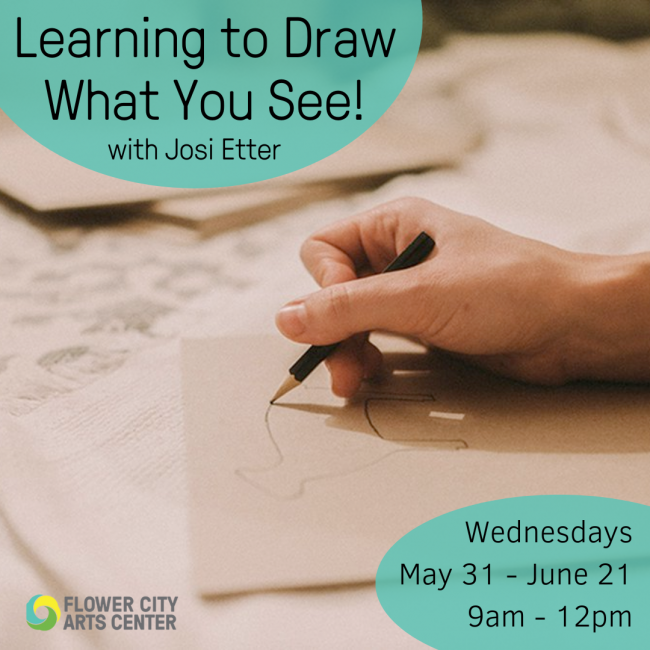 Learning to Draw What You See with Josi Etter on Wednesdays, May 31 - June 21 from 9am - 12pm.