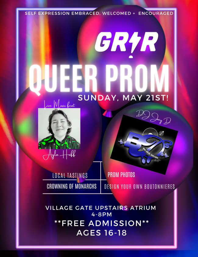 This event is free for all LGBTQ+ youth and allies, ages 16-18 to attend! Tastings, Prom photos, Live entertainment from Ayla Huff Music, DJ Big Deal Sounds spinning all your favorite tunes, + design your own Boutonniere's!