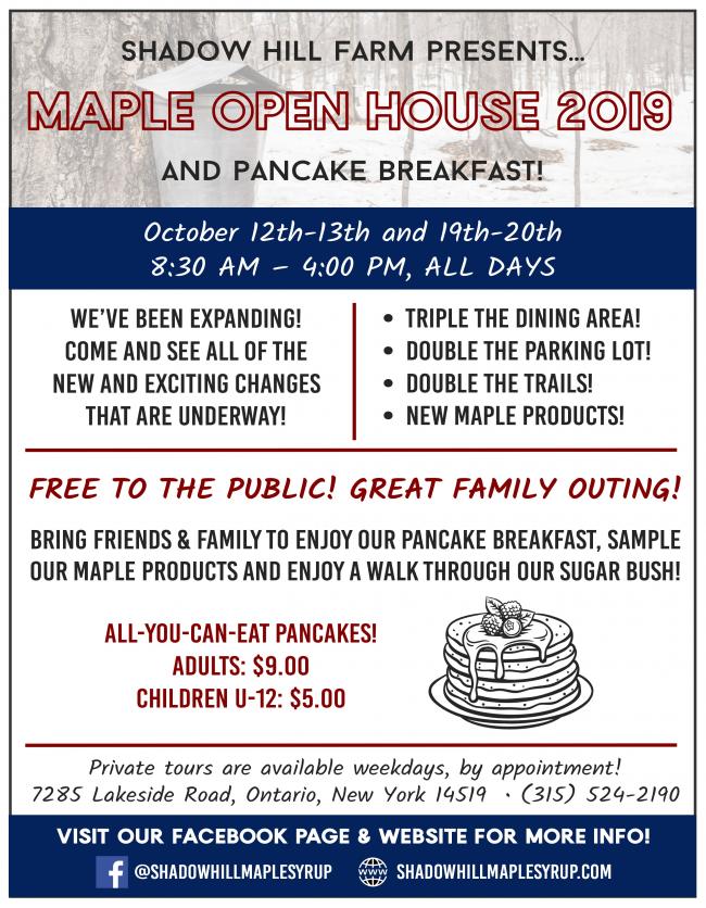 Enjoy a pancake breakfast in the new dining area! Taste all of the different syrup grades as well as many different maple products! Learn how syrup is made (it really is an amazing process!) and walk the trails in the beautiful fall foliage! See all of the changes on the farm! Certainly a fun filled family day at the Farm!