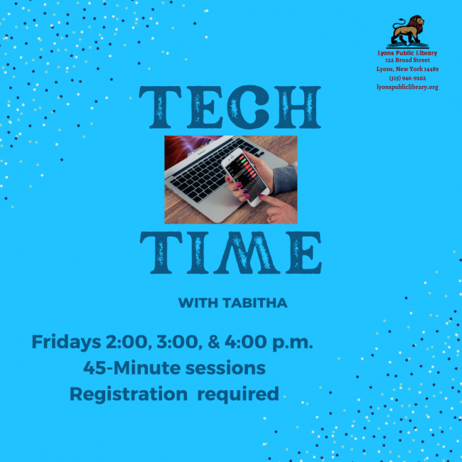 Do you need help with your phone, laptop, tablet, or other gadgets? Register today for a 45-minute, one-on-one session with Tabitha. Appointments are available at 2:00, 3:00, and 4:00 p.m. Please bring your device, cables, and passwords. Registration is required. To register, follow the link below or call the library at (315) 946-9262. https://owwl.libcal.com/calendar/LyonsPublicLibrary